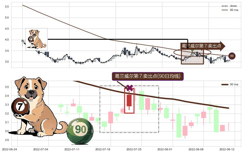形态多维评估: ⚀ 2022-07-21-日显现 葛兰威尔均线 90日均线 第⑦卖出点 下降趋势的中继信号,后市看跌,卖出信号