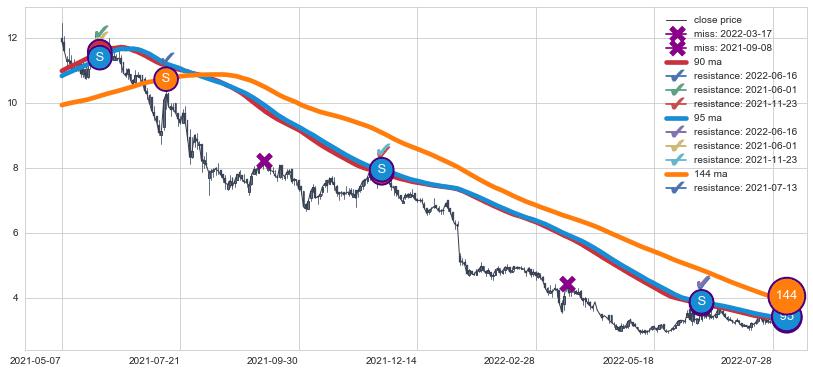 下跌趋势2021-05-07-2022-07-28,均线144, 90, 95确认关键阻力4处