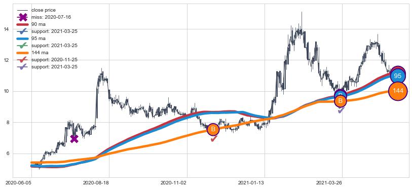 上涨趋势2020-06-05-2021-05-13,均线144, 90, 95确认关键支撑2处