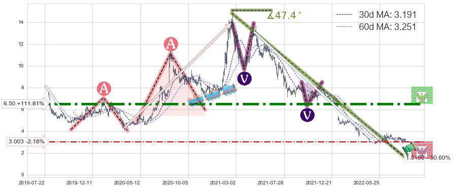 ♘ 阻力价格位6.50,可信任强度91.64%,距离最后交易2022-08-12形成的收盘价格3.070相差 +111.81%