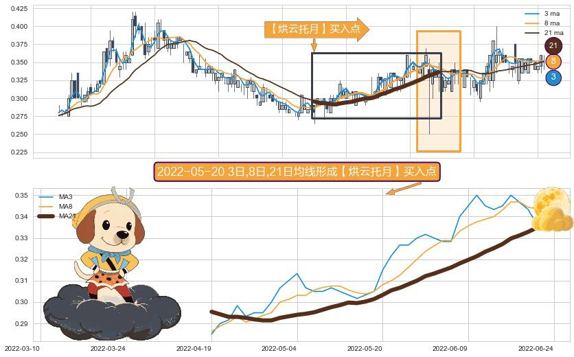 ⚀ 2022-04-19日-2022-06-22日显现 3日-8日-21日均线 【烘云托月】买入点 看多信号,后市看涨,买入