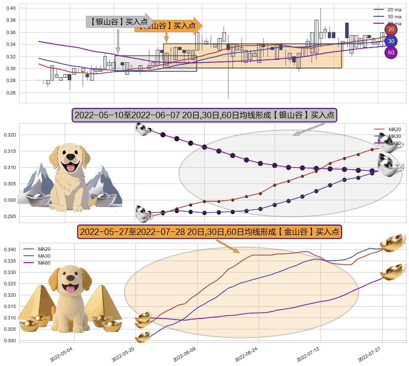 ⚀ 2022-05-30-日至2022-07-28-日显现 20日-30日-60日均线 【金山谷】买入点 其再次确认了买入信号,可靠性更强,买入