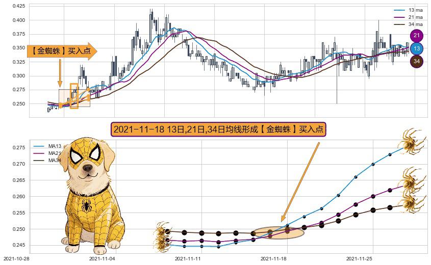 ⚀ 2021-11-18日显现 13日-21日-34日均线 【金蜘蛛】买入点 看多信号,后市看涨,买入