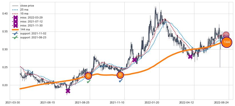 ⚁ MA3和MA8走势平行,且始终保持在短距离内,MA21始终在短中期均线下方,与短中期均线保持一定的距离,微微上行