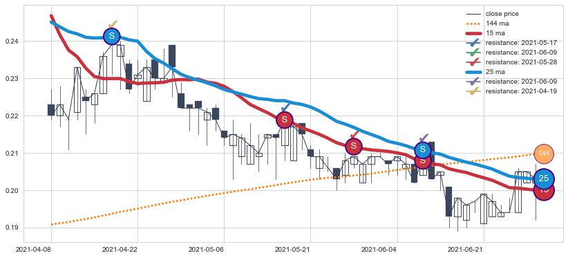 ⚁ MA3和MA8走势平行,且始终保持在短距离内,MA21始终在短中期均线上方,与短中期均线保持一定的距离,微微下行