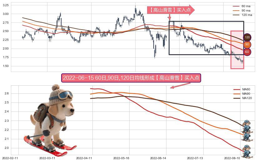 形态多维评估: ⚀ 2022-04-08日-2022-08-12日显现 60日-90日-120日均线 【高山滑雪】买入点 看多信号,后市看涨,买入