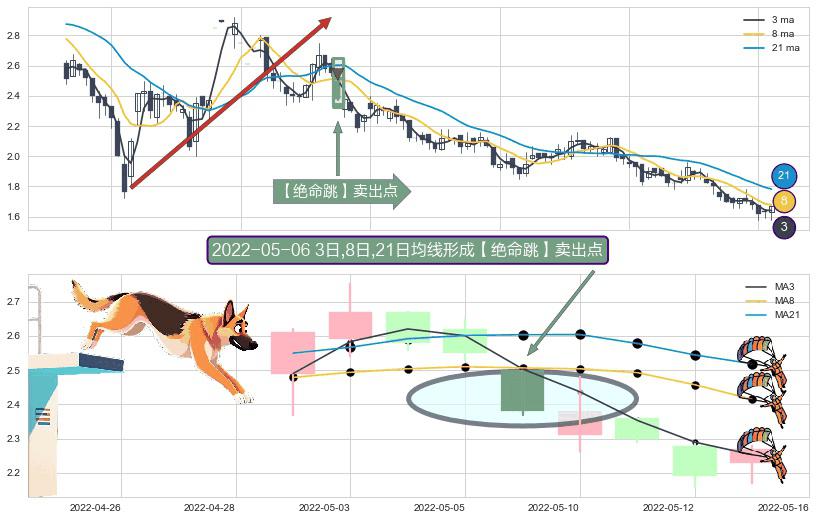 形态多维评估: ⚀ 2022-05-06日显现 3日-8日-21日均线 【绝命跳】卖出点 看空信号,后市看跌,卖出