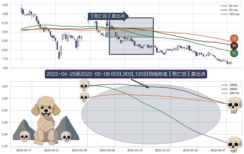 形态多维评估: ⚀ 2022-05-03-日至2022-06-08-日显现 60日-90日-120日均线 【死亡谷】卖出点 看空信号,后市看跌,卖出