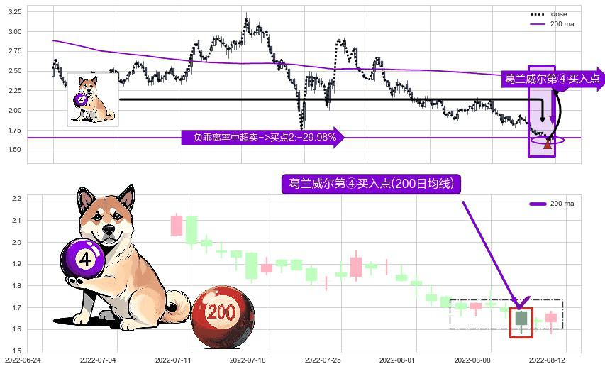 形态多维评估: ⚀ 2022-08-10-日显现 葛兰威尔均线 200日均线 第④买入点 下降趋势均值回复的短线反弹信号,后市看涨,买进信号