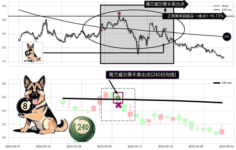 形态多维评估: ⚀ 2022-05-05-日显现 葛兰威尔均线 240日均线 第⑧卖出点 下降趋势的中继信号,后市看跌,卖出信号