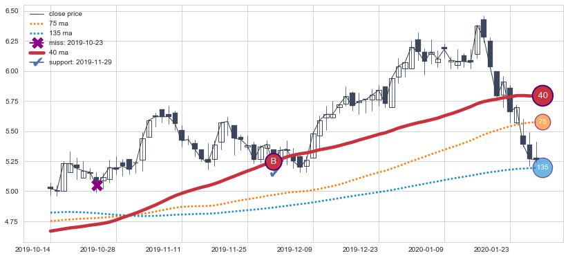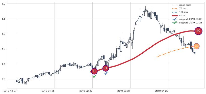 上涨趋势2018-12-27-2019-05-21,均线40确认关键支撑2处