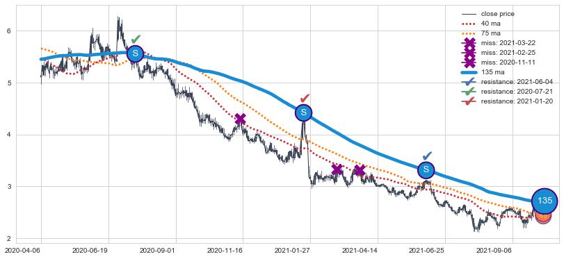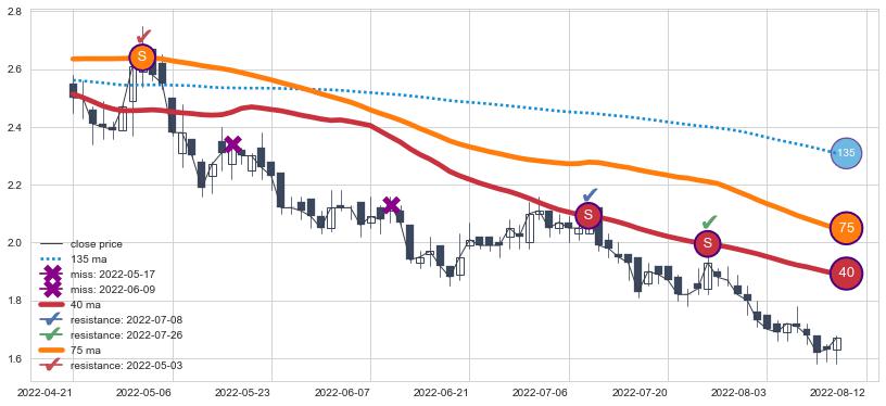 下跌趋势2022-04-21-2022-08-12,均线40, 75确认关键阻力3处