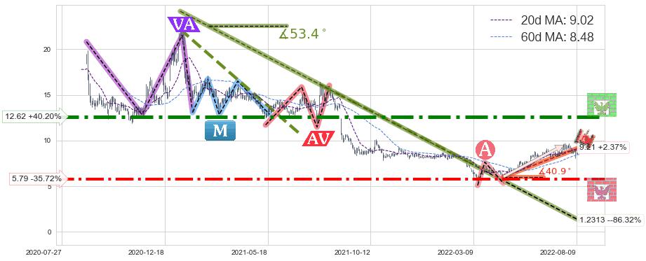 ♘ 支撑价格位5.79,可信任强度74.47%,距离最后交易2022-08-12形成的收盘价格9.00相差 -35.72%