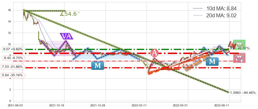 ➢ 【仅预测突破】最后价格:9.00与预测突破价格:8.59→【空间较大】后续最小【反转】第一目标价格→(2022-09-13: 7.57 )