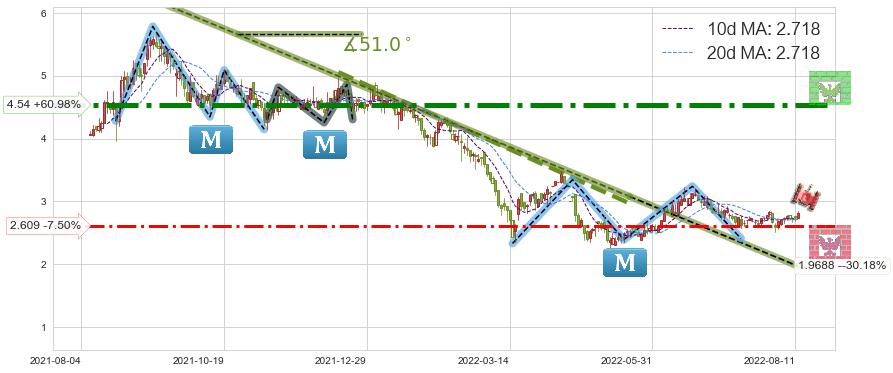 ♘ 阻力价格位4.54,可信任强度90.54%,距离最后交易2022-08-12形成的收盘价格2.820相差 +60.98%