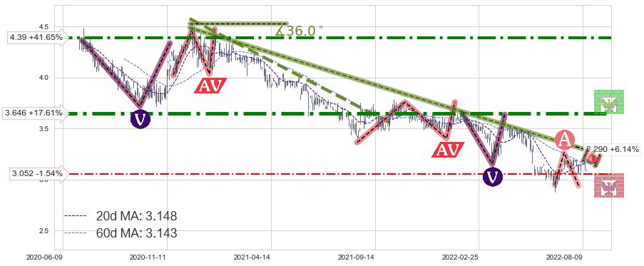 ♘ 阻力价格位3.646,可信任强度94.54%,距离最后交易2022-08-12形成的收盘价格3.100相差 +17.61%