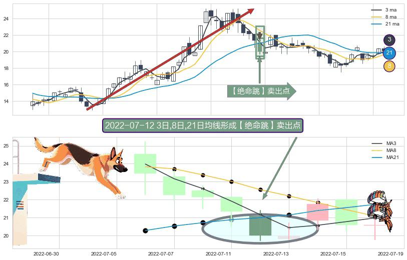 ⚀ 2022-07-12日显现 3日-8日-21日均线 【绝命跳】卖出点 看空信号,后市看跌,卖出