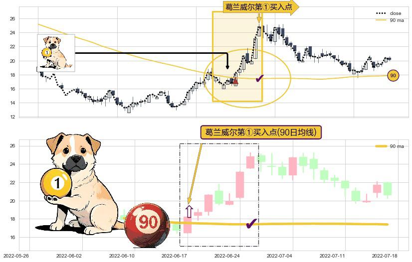 ⚀ 2022-06-17-日显现 葛兰威尔均线 90日均线 第买①入点 走势反转见底信号,后市看涨,买进信号