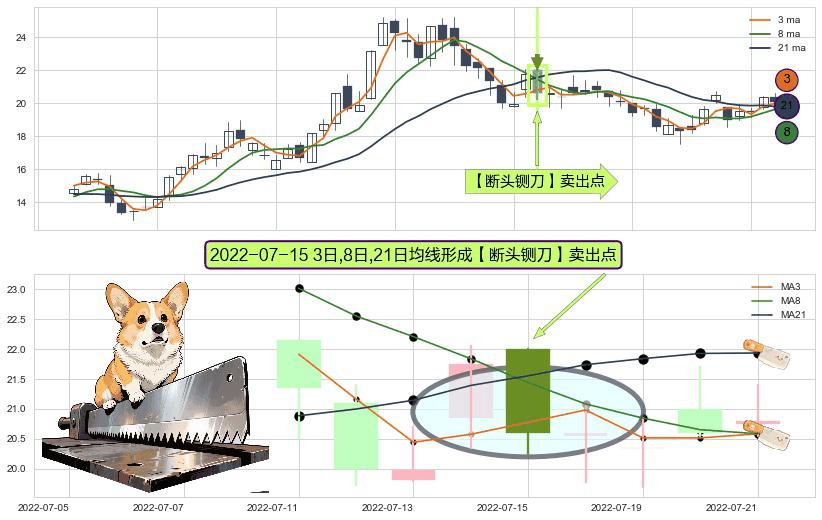 ⚀ 2022-07-15日显现 3日-8日-21日均线 【断头铡刀】卖出点 看空信号,后市看跌,卖出