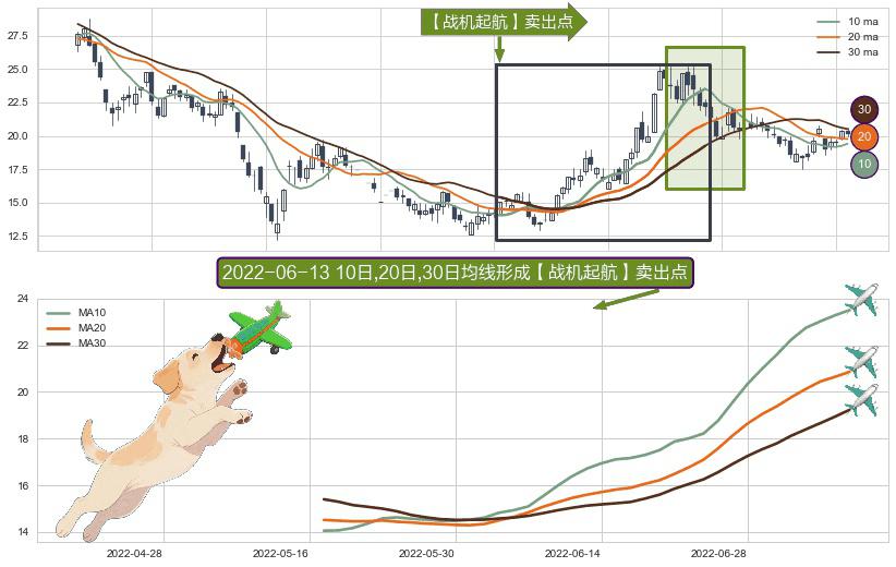 ⚀ 2022-05-17日-2022-07-08日显现 10日-20日-30日均线 【战机起航】卖出点 看空信号,后市看跌,卖出
