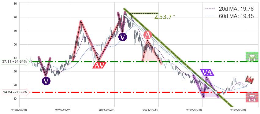 ♘ 支撑价格位14.54,可信任强度71.49%,距离最后交易2022-08-12形成的收盘价格20.10相差 -27.68%
