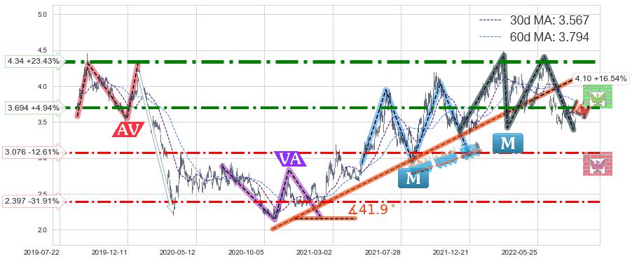 ♘ 阻力价格位3.694,可信任强度82.78%,距离最后交易2022-08-12形成的收盘价格3.520相差 +4.94%