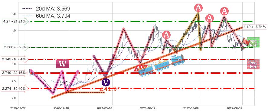 ♘ 支撑价格位2.740,可信任强度92.73%,距离最后交易2022-08-12形成的收盘价格3.520相差 -22.16%