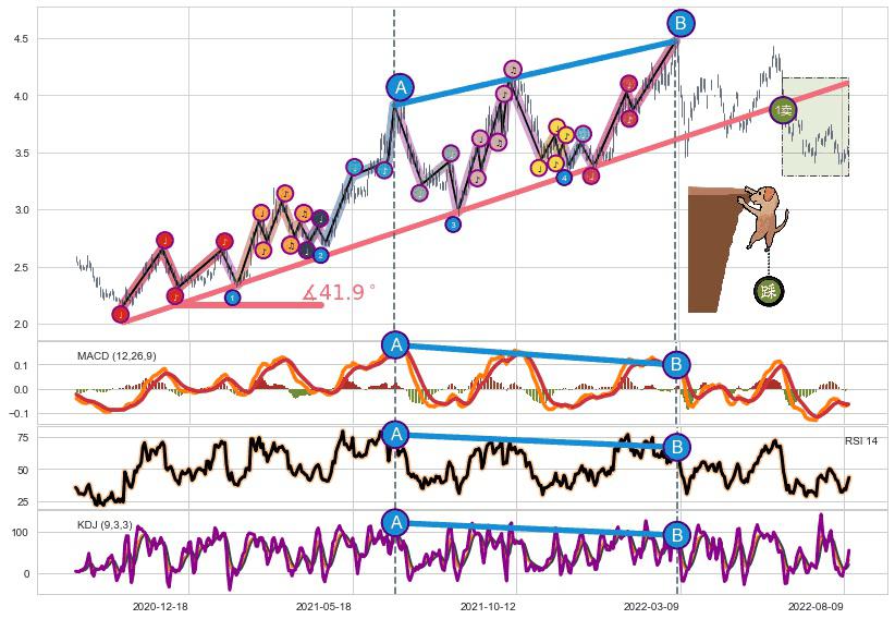 ✂️ 2020-10-22-2022-03-14上升趋势存在反转[风险],其原上升趋势的支撑位(4.10)已破位[强阻力信号],原上升趋势角度: 41.9˚