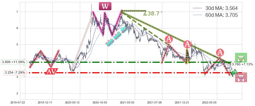 ♘ 阻力价格位3.899,可信任强度83.67%,距离最后交易2022-08-12形成的收盘价格3.510相差 +11.09%