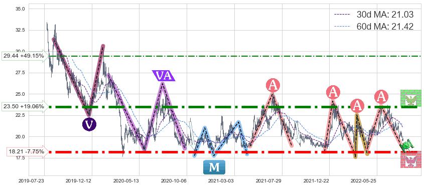 ♘ 支撑价格位18.21,可信任强度99.00%,距离最后交易2022-08-12形成的收盘价格19.74相差 -7.75%