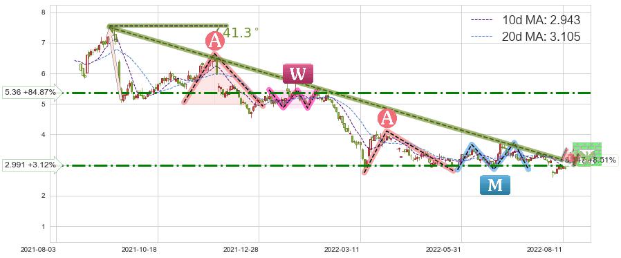 ♘ 阻力价格位2.991,可信任强度66.97%,距离最后交易2022-08-12形成的收盘价格2.900相差 +3.12%