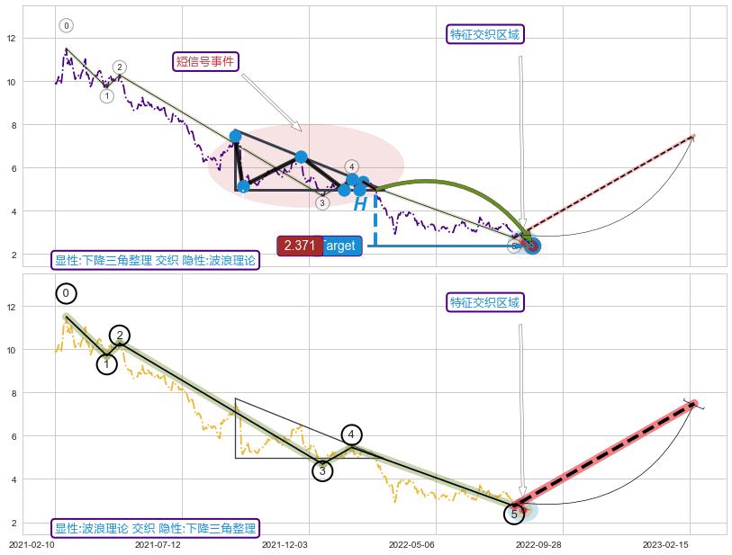➢ 【多方力量耗尽,空方打破攻守平衡点】下降三角形中继整理, 已在2022-02-22突破【支撑】颈线 4.98 →演变成下降通道
