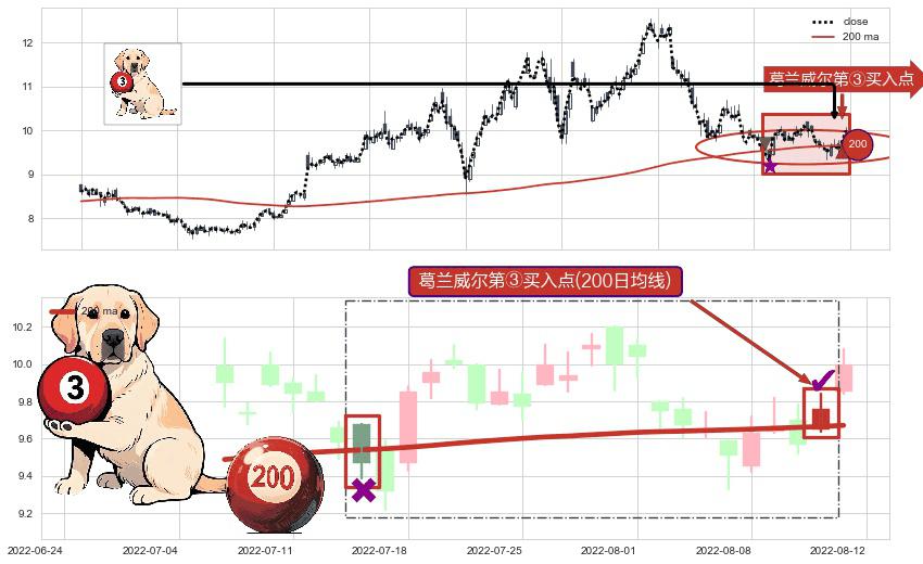 形态多维评估: ⚀ 2022-08-11-日显现 葛兰威尔均线 200日均线 第③买入点 上升趋势的中继信号,后市看涨,买进信号