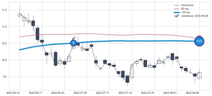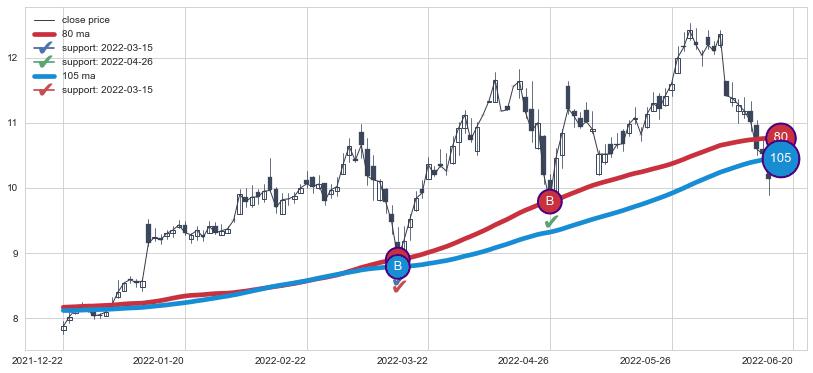 上涨趋势2021-12-22-2022-06-20,均线80, 105确认关键支撑2处