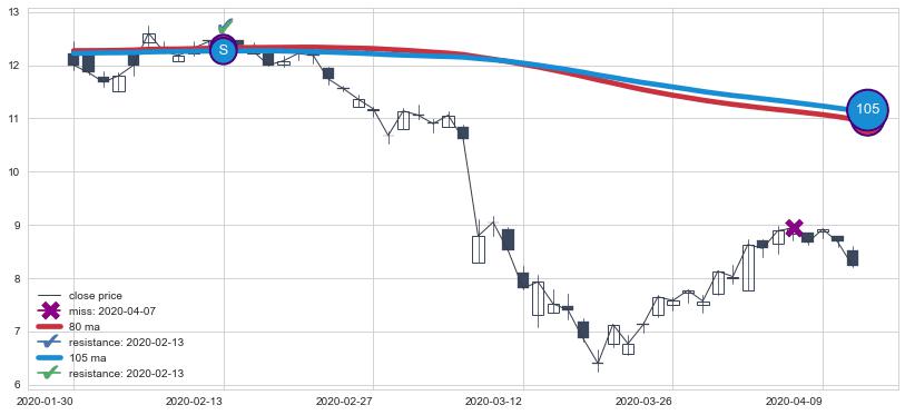 下跌趋势2020-01-30-2020-04-15,均线80, 105确认关键阻力1处