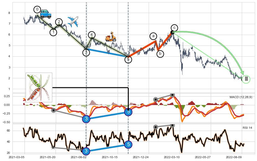 ➣ a,c调整浪MACD, RSI, KDJ走势都【未出现】背离,abc走势延续, 5浪反转概率增强