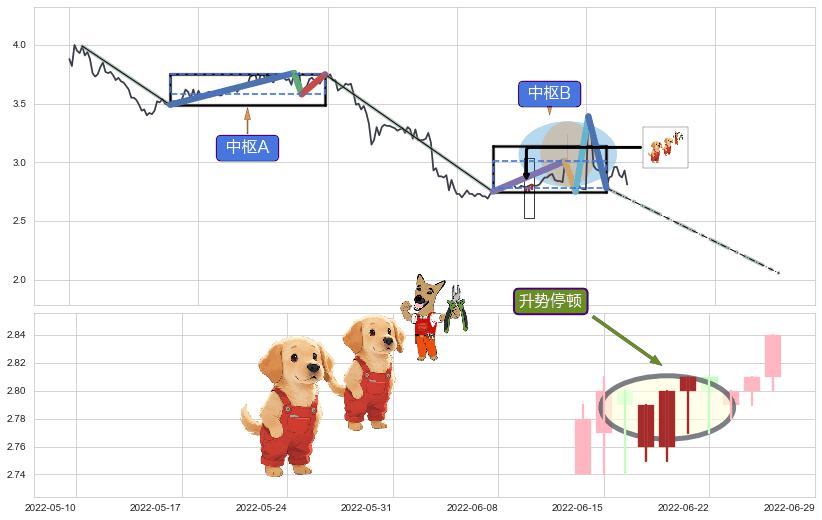 ➣ 【中枢B】:2022-05-30-2022-08-02,中枢由5笔构成,共45交易日, ZG=3.010, ZD=2.780