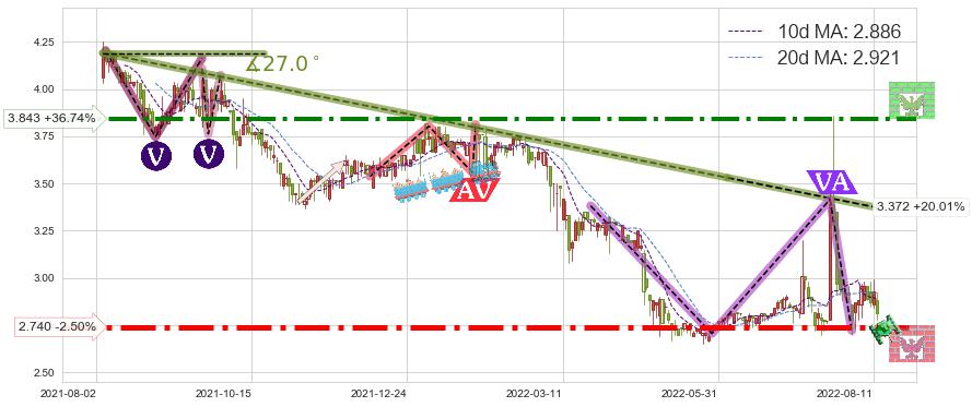 ♘ 阻力价格位3.843,可信任强度81.32%,距离最后交易2022-08-12形成的收盘价格2.810相差 +36.74%