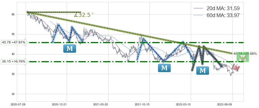 ♘ 在最后的下跌阶段2020-08-03至2022-08-12,存在 持续未破位的阻力位 ,阻力价格40.14,可信任强度88.47%,其距离最后价格30.95相差 +29.68%