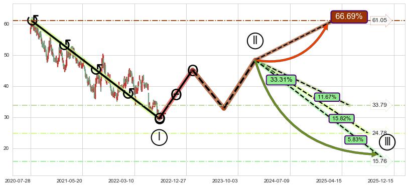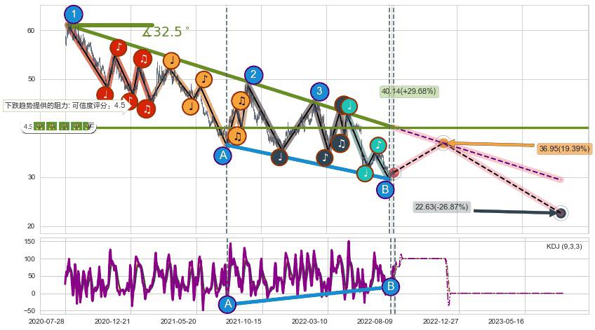 ➣ D点拟合预测价格56.17,距离最后交易收盘价格30.95相差 +81.48%