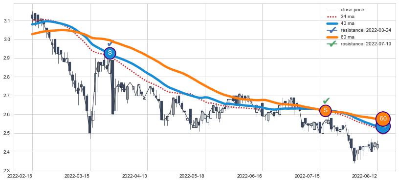 下跌趋势2022-02-15-2022-08-12,均线40, 60确认关键阻力2处