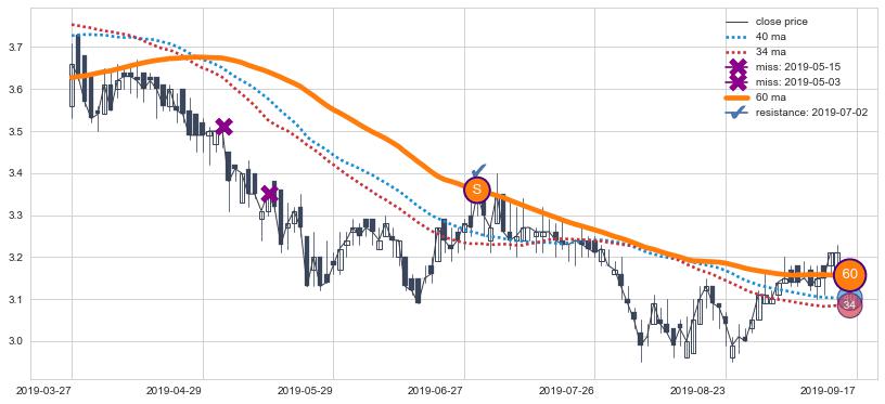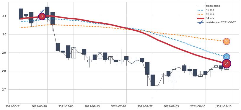 下跌趋势2021-06-21-2021-08-16,均线34确认关键阻力1处