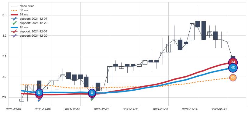 上涨趋势2021-12-02-2022-01-24,均线40, 34确认关键支撑2处