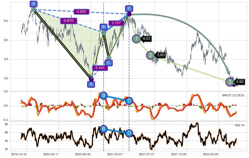 ➢ 谐波价格D点比B点高 ⤴,【MACD】指标D点比B点低 ⤵️