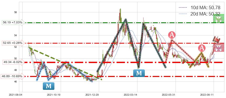 ♘ 支撑价格位49.34,可信任强度96.31%,距离最后交易2022-08-12形成的收盘价格52.50相差 -6.02%