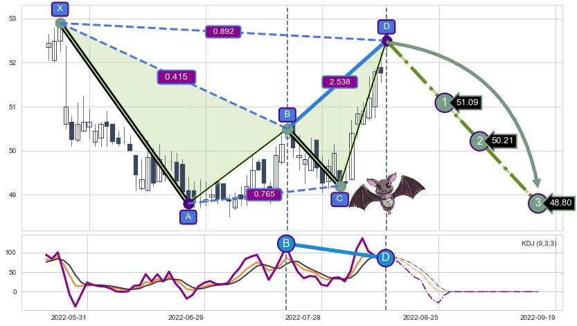 ➣ 已完成【蝙蝠】形态起点X: 2022-05-24, 终点D: 2022-08-12, 共57交易日