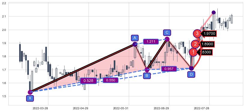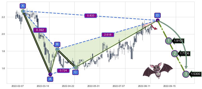 ➣ 未完成【蝙蝠】形态起点X: 2022-02-04, 已到达C点: 2022-04-25, 预测最终D点: 2022-08-22, 共125交易日