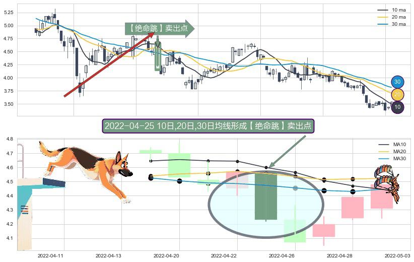 形态多维评估: ⚀ 2022-04-25日显现 10日-20日-30日均线 【绝命跳】卖出点 看空信号,后市看跌,卖出
