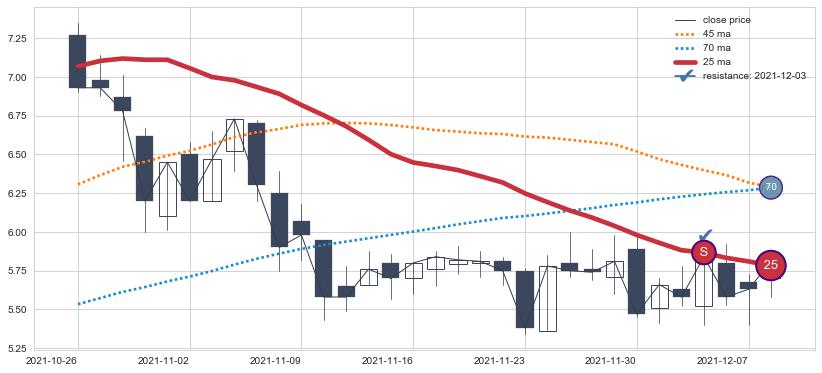 下跌趋势2021-10-26-2021-12-08,均线25确认关键阻力1处