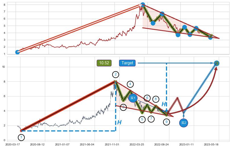 ➣ 【未确认突破,预测即将形成突破】降🚩楔型起点:2020-03-24, 预测突破点:2022-08-10,形态共586交易日